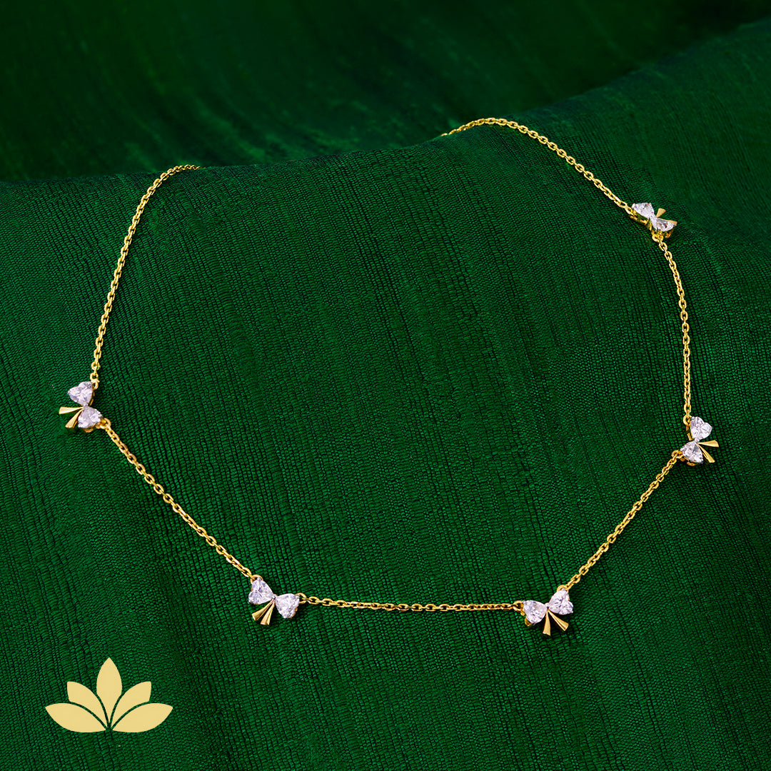 Two Heart shaped premium zirconia stones placed horizontally, facing each other to create a bow shape. There are two silver curved strands fixed at their meeting point, adding to the illusion of a bow. There are five such bows, placed at equal distant. This piece is finished with a real gold polish. The length of this necklace is 14”, with an additional 1” adjustable section.