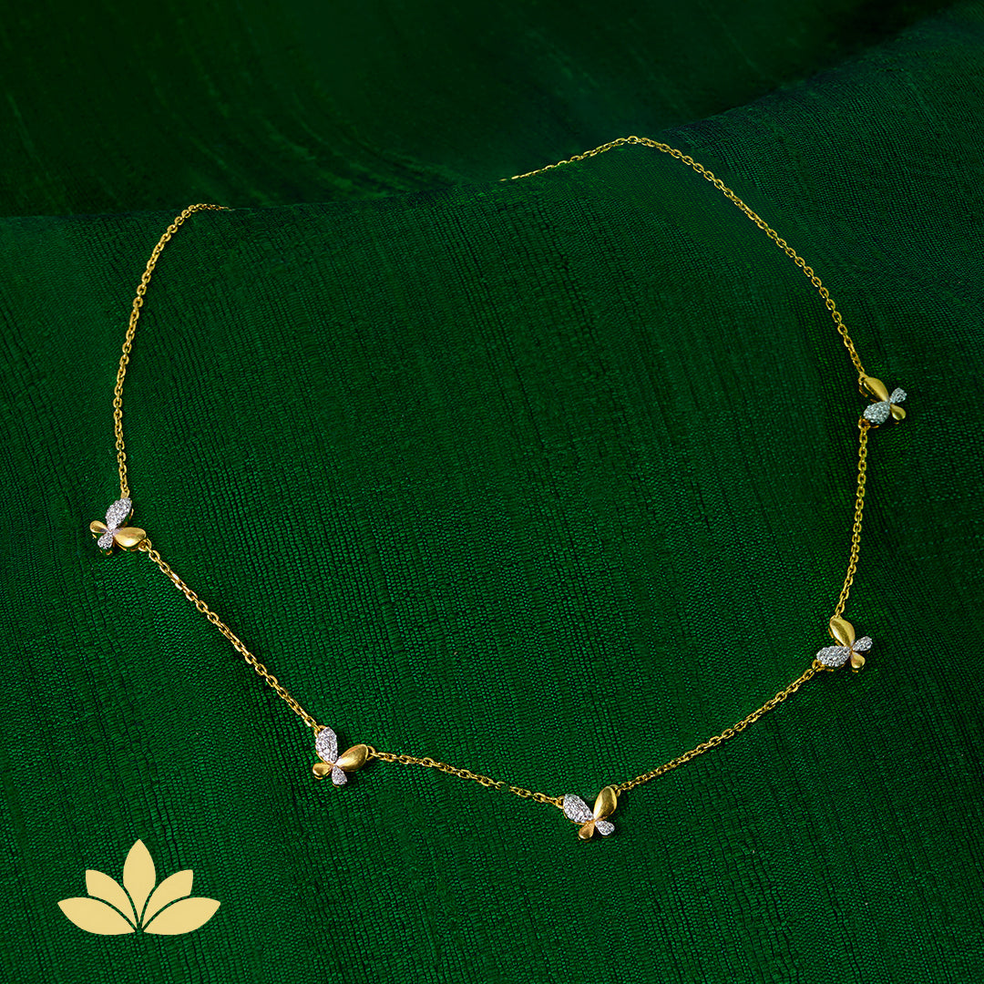 Pure silver, gold polished plates placed diagonally across a cluster of premium zircon stones, creating a beautiful butterfly shape. The top two wings are bigger than the smaller two wings. There are five such butterflies, placed at equal distant. This piece is finished with a real gold polish. The length of this necklace is 14”, with an additional 1” adjustable section.