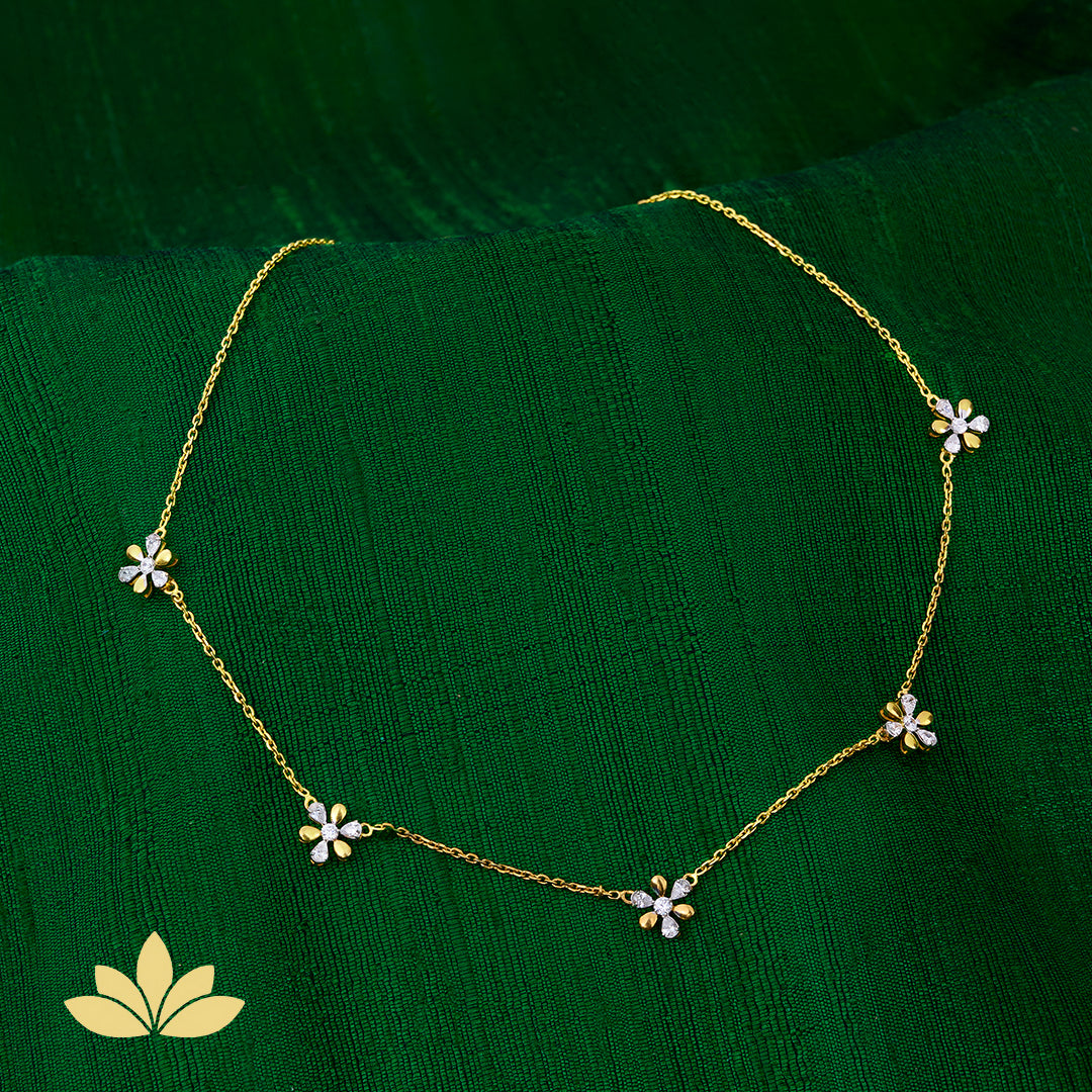 Three drop shaped premium zircon stones placed in a circular shape, alternating with drop shaped silver plates, creating a flower shape. There is a small round zircon stone placed in the middle of the flower. There are five such flowers, placed at equal distant. This piece is finished with a real gold polish. The length of this necklace is 14”, with an additional 1” adjustable section.