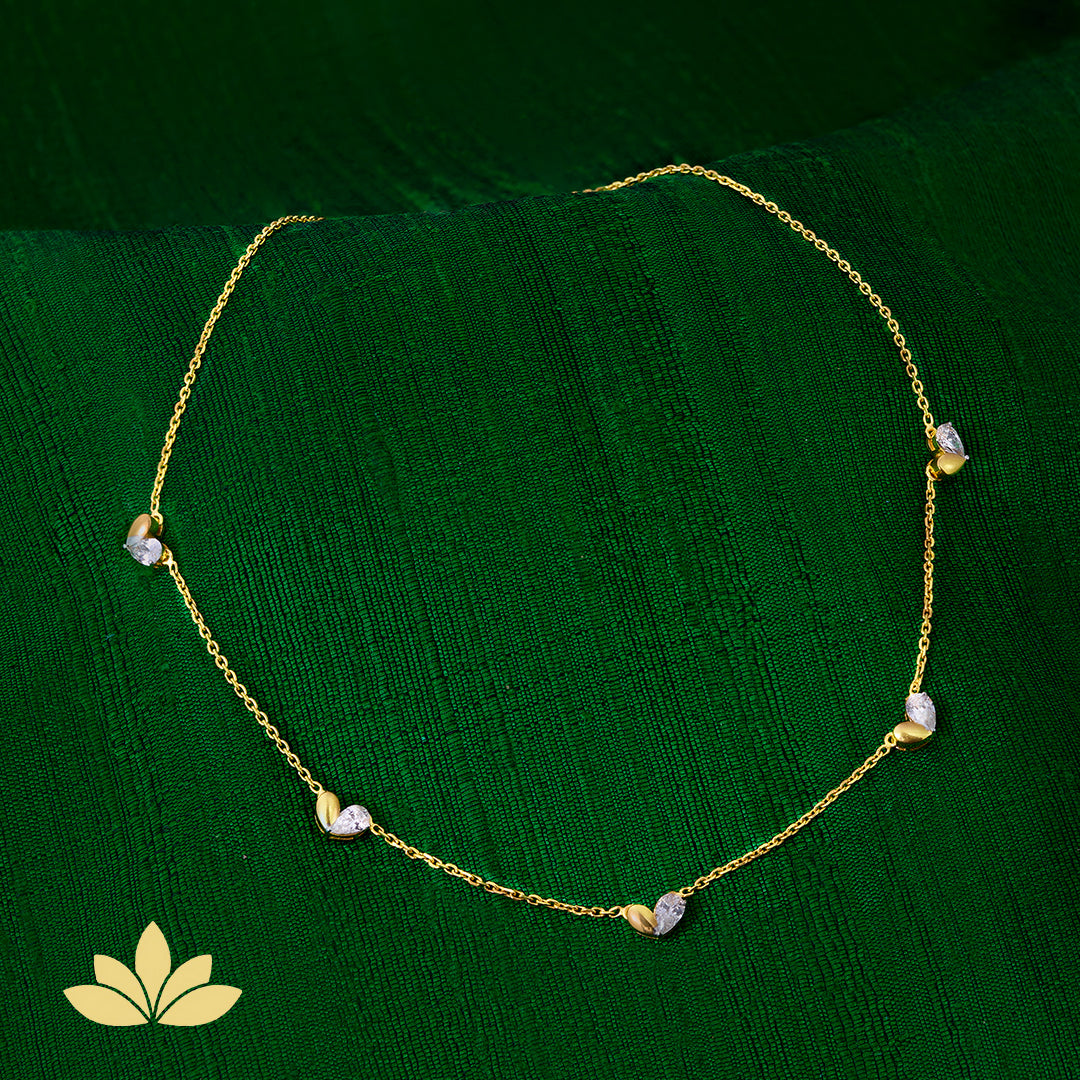 One drop shaped premium zircon stone placed opposite a drop shaped silver plate, both at opposing diagonals, creating a heart shape. There are five such hearts, placed at equal distant. This piece is finished with a real gold polish. The length of this necklace is 14”, with an additional 1” adjustable section.