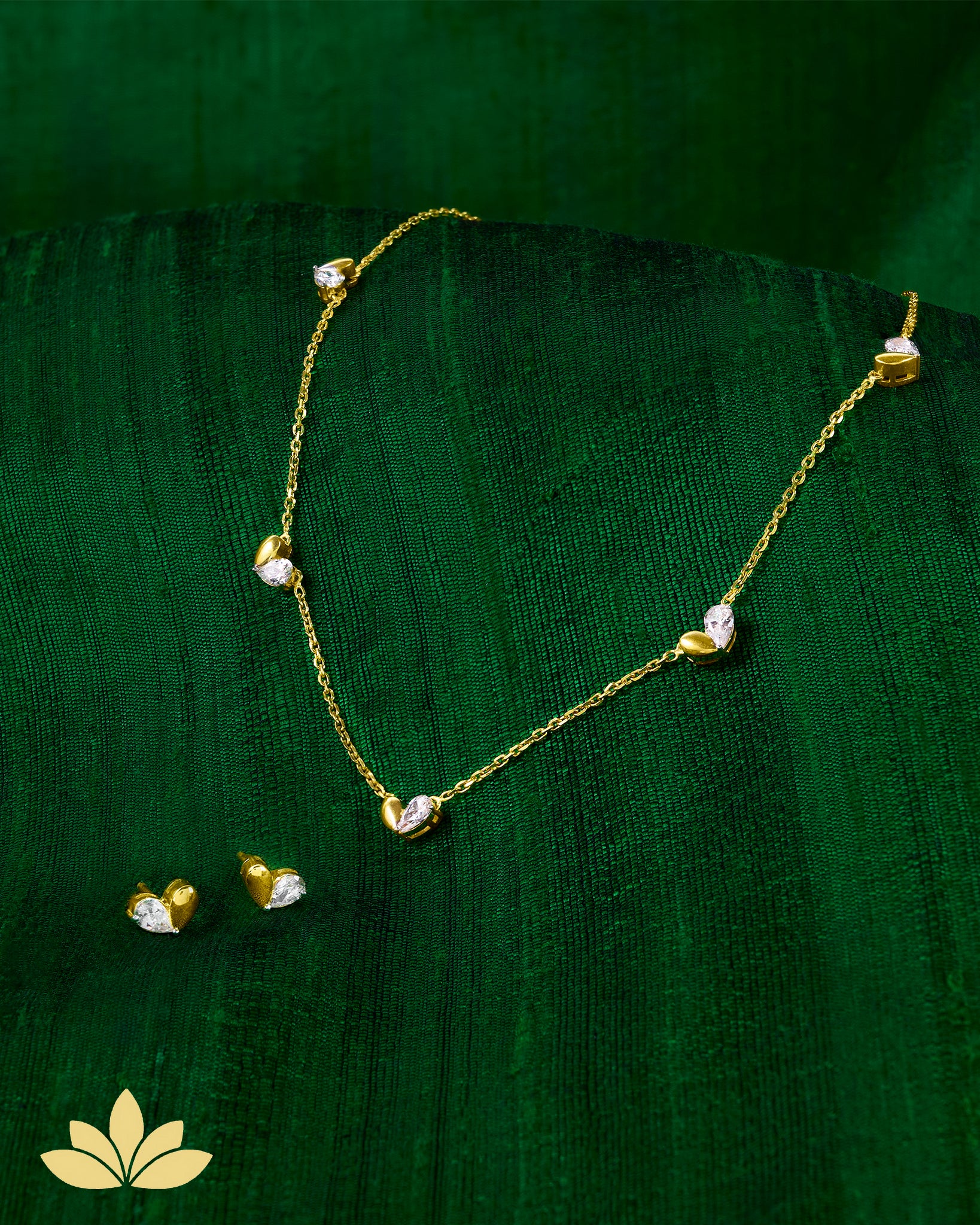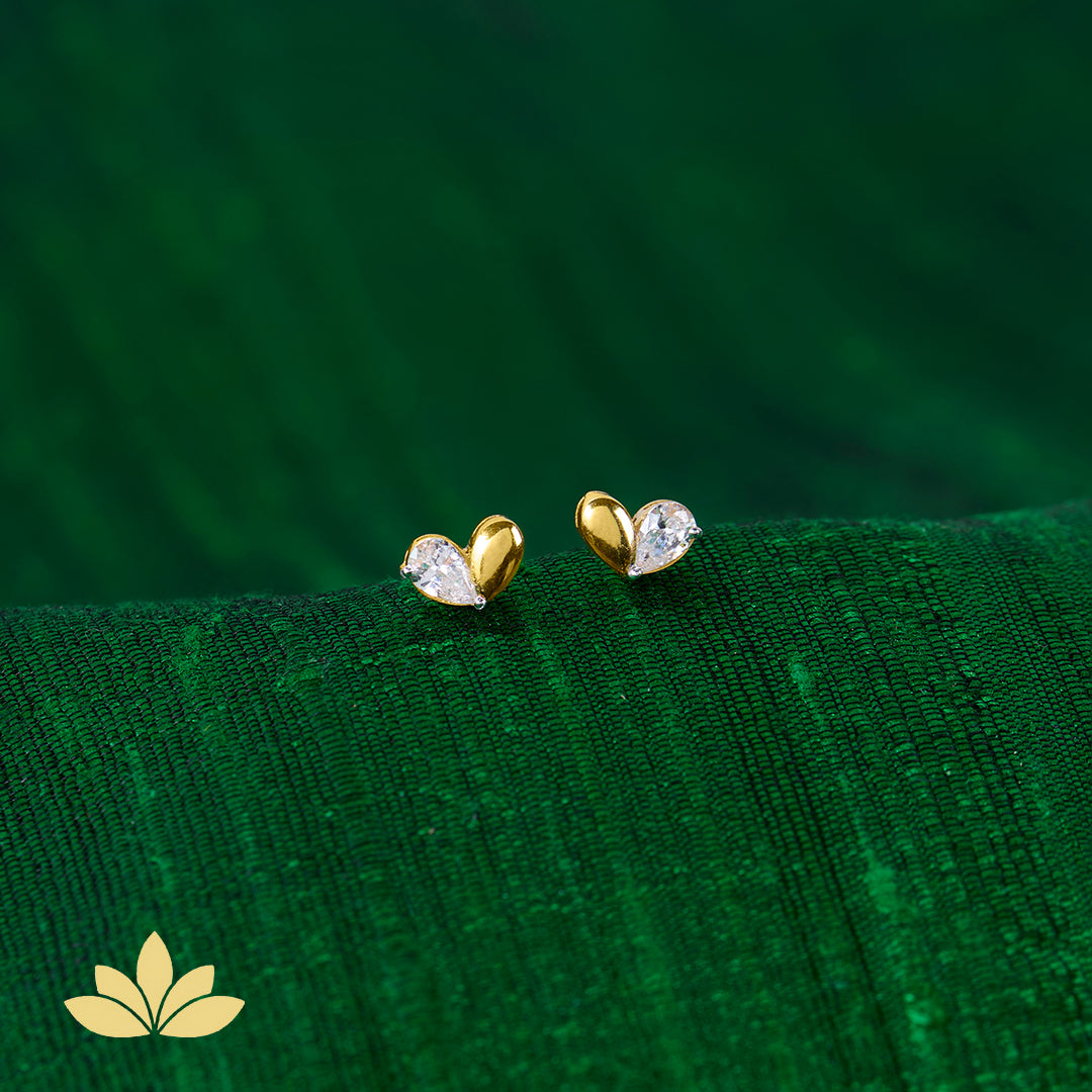 One drop shaped premium zircon stone placed opposite a drop shaped silver plate, both at opposing diagonals, creating a heart shape. This is finished with a real gold polish. This earring is supported by our proprietary push back paige. It is less than 1” in height.
